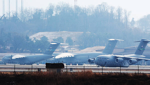 △3月6日,韩国平泽乌山空军基地内的美军运输机。