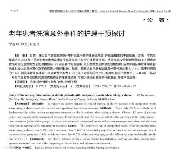 参考资料:[1]曾会群.老年患者洗澡意外事件的护理干预探讨[J].临床合理用药杂志我要配资网,2013