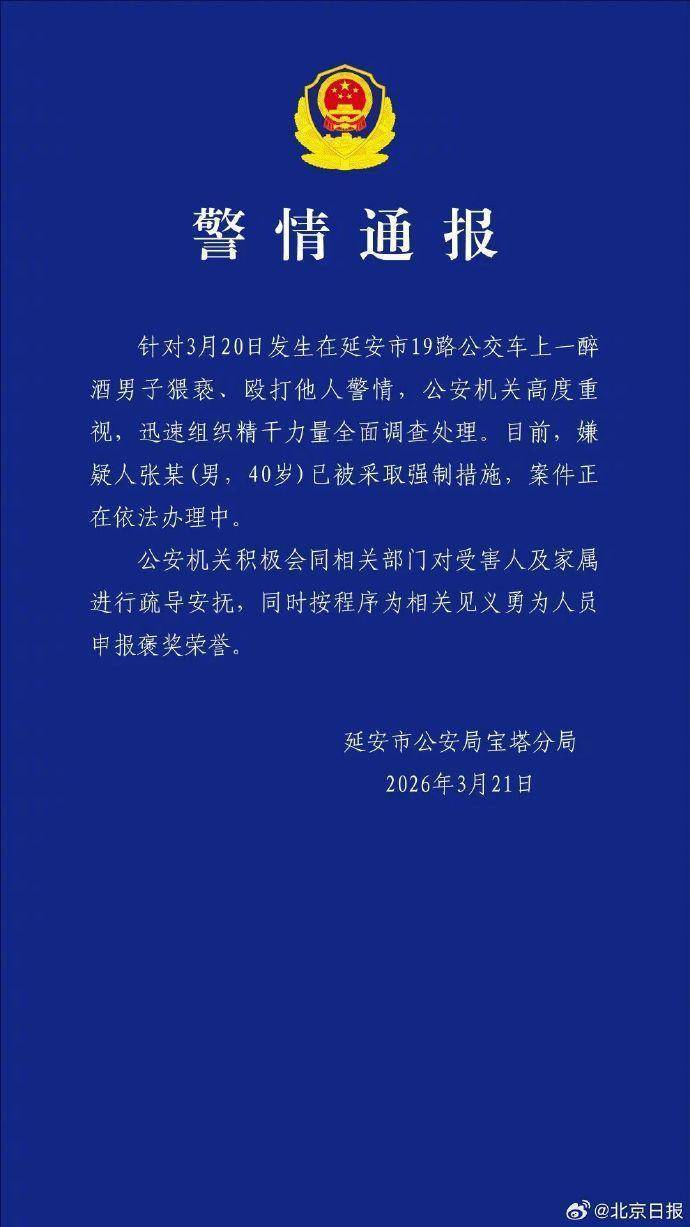 针对3月20日发生在延安市19路公交车上一醉酒男子猥亵、殴打他人警情,公安机关高度重视,迅速组织精干力量全面调查处理。目前,嫌疑人张某(男,40岁)已被采取强制措施,案件正在依法办理中。公安机关积极会同相关部门对受害人及家属进行疏导安抚,同时按程序为相关见义勇为人员申报褒奖荣誉。