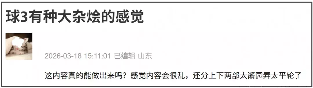 不过,此前片方就透露《流浪地球3》将会分成上下两部,上部预计在2027年春节档上映,下部预计会在2027暑期档或者2028春节档上映。这样的安排的确能在一定程度上缓解时长的压力,但同时也会加大剧情的压力。上下两部的上映方式,全明星加盟的演员阵容,《流浪地球3》在很多人眼中堪称是《酱园弄》2.0。