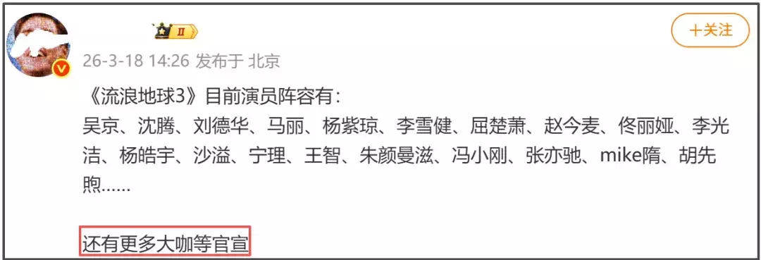 据业内人士爆料,除了已经官宣的这些各种类型的演员之外,还有更多大咖等着官宣。这样的“全明星阵容”不仅没有引爆观众的期待,反而加深了观众的“恐惧”。前车之鉴,有太多类似的大咖云集的影片最后扑得一塌糊涂,前有《建国大业》,后有《酱园弄》。看现在的舆论走向,也难怪有网友嘲讽《流浪地球3》是“建球大业”了。
