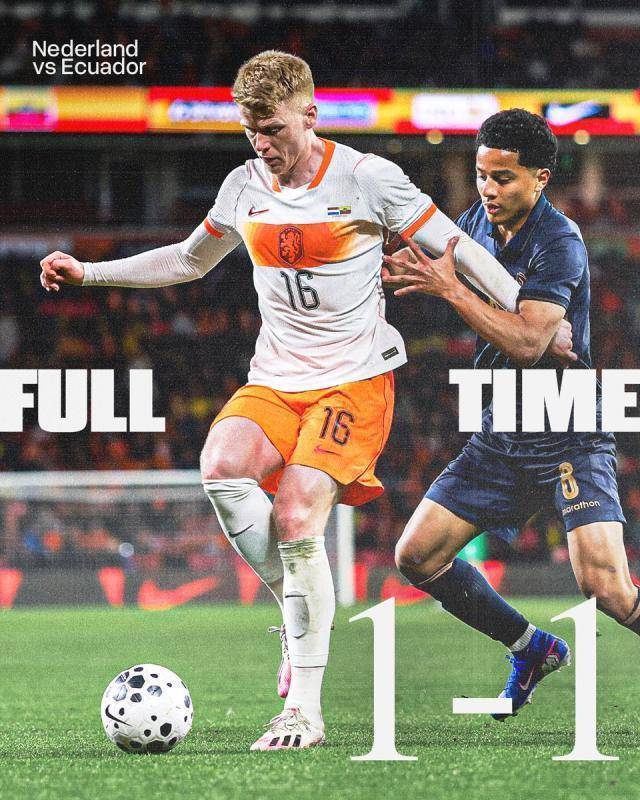 国际足球友谊赛,荷兰队坐镇菲利普球场迎战厄瓜多尔队。荷兰开场3分钟就取得领先,但很快邓弗里斯被红牌罚下,并被对手点球扳平。