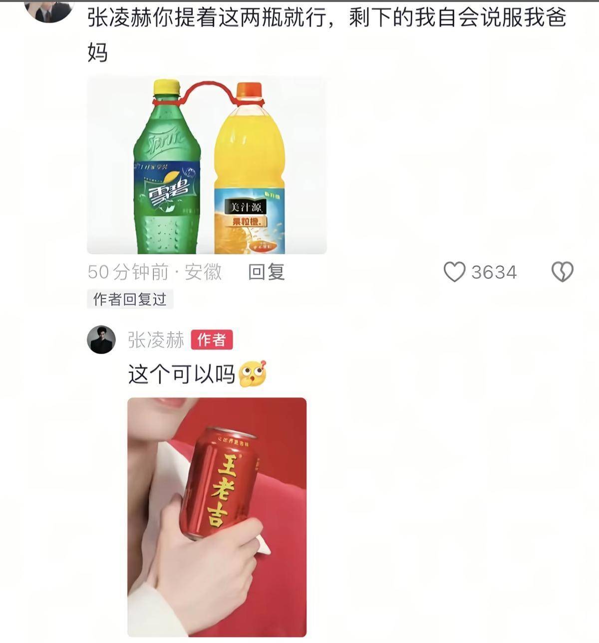 看到此消息,很多网友联想到网友们的玩梗。当时有网友表示:张凌赫,你就拎着这两瓶就行,剩下的我会说服我爸妈。结果张凌赫真的进行了评论,还带着王老吉来了。