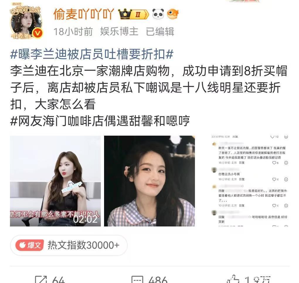 事情起因很简单,李兰迪日常购物时,随口向店员询问是否有优惠折扣,这本是普通人消费时再正常不过的举动,却被店员私下吐槽,直言她是十八线艺人,没名气还刻意要优惠,这番言论被曝光后,迅速在网络发酵,让李兰迪莫名背负骂名,一件微不足道的小事,被无限放大恶意解读,实在让人觉得离谱又心寒。此事发酵后,网友迅速分成两大观点阵营,争论激烈且直白。一方网友全力力挺李兰迪,认为她的行为完全合情合理,艺人首先是普通人,消费时询问折扣是所有人的正常权利,和身份地位毫无关系,店员私下吐槽艺人的行为,纯属双标且不尊重人,十八线艺人的说法更是恶意拉踩,没必要因为艺人身份,就对其日常行为过度苛责。另一方网友则觉得李兰迪没必要,认为艺人收入远高于普通人,没必要在意小额优惠,此举显得小气,既然是公众人物,就该时刻注意言行,被吐槽也情有可原。